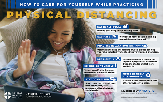 We encourage you to commit to taking care of yourself during this time and always. You might consider practices such as exercising, being kind to yourself, monitoring your media consumption, enjoying a healthy hobby, connecting with others, and engaging in mindfulness activities.